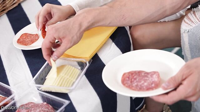 A picnic indoors turns into a sexy tease and passionate sex .