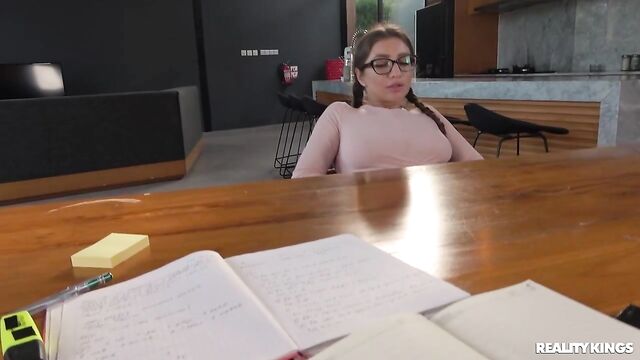 Description:Kriss Kiss may have passed her diploma, but Rico Hugi is still studying, and he needs to focus. The bespectacled brunette thinks what Rico needs is to beat his stress with a good distraction, and her ass as she bends over is a great start. Rico catches her playing with her pussy under the table, and the glasses babe crawls over to suck his cock and slide it between her big tits. Kriss shows him what she wants as she bends over and fingers her booty. Rico doesn't need to be asked twice to fuck that ass and cum on her big tits!