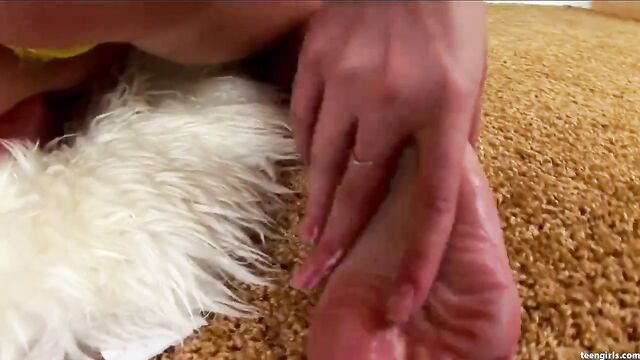 Description:Golden-haired Darcie really has that innocent princess look going for her. Under that tangerine thongs and sunny underwear breathes a teenage pussy. I am seeing pure honey from the top of her golden head to the tips of her succulent toes! Darcie plays with her wet, moist poon and gives us a peek at teenage knockers. She takes out some lotion and squirts it generously onto her feet. Even if you are not a foot-fetish-man do yourself a favor by watching Darcie carefully fondel her slender young feet and her pink muff that's pleading to be pounded by a huge dick.