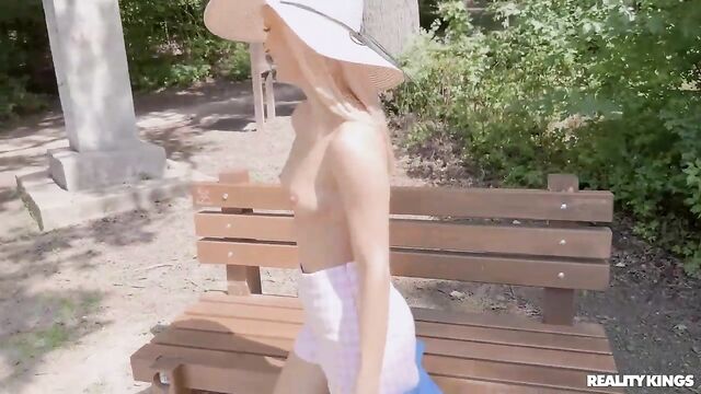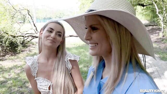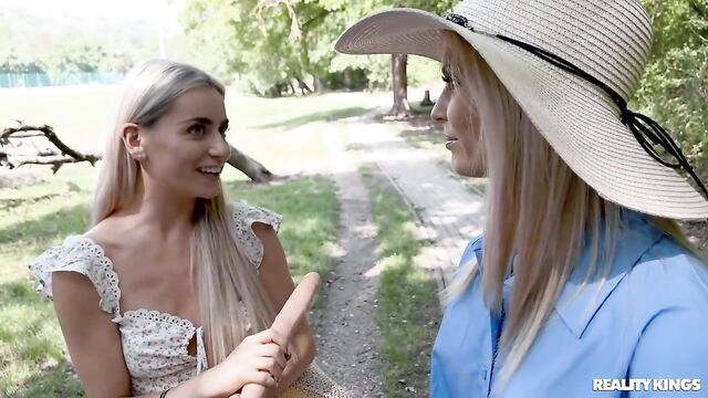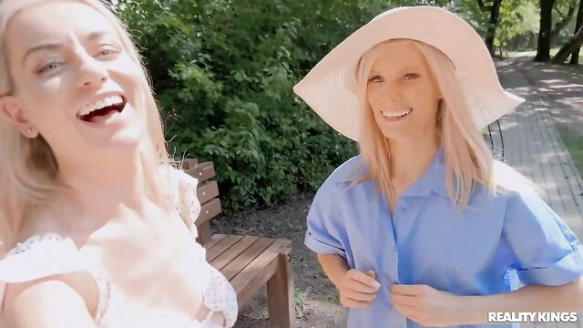 Description:Blonde vlogging roommates Candee Licious and Emily Bellex are taking their series of dare videos up a notch, because today the weather's so nice, they came to a public park to play their naughty game. Candee is shy at first when Emily dares her to jump on a bench with her tits out, but soon she's stripping totally naked and running around with a dildo in her ass! After the pair nearly get caught, they find a more secluded spot where Candee gets to use the toy on Emily's booty and see how long they can play before someone sees them.