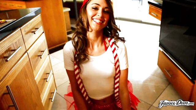 Description:Riley Reid is Santa’s little helper. She wears a white cropped top showing her abs and a red tutu skirt too short that her butt cheeks are already showing. A green elf hat is on her head and a red and white jumper strap is attached on her tutu. She completes her outfit with a pair of red and white knee-high socks. Under her clothes is a pair of pussy red undergarments. Riley is busy wandering around the kitchen. She pulls out some baked Christmas cookies from the oven. Right after, she teasingly lifts up her skirt and shows off her petite butt cheeks. She then heads to where Erik Everhard is standing already naked and without any warning, grabs his big cock by the hand and puts his full-length member inside her mouth. She gives him a blowjob until he cums in her mouth. She happily swallows his warm juices. Erik loves her mouth on his dick that the moment he finishes, he hurriedly returns the favor. He turns her around, her back on her chest as she faces the kitchen counter. He eats her pussy as she bends over and lays her upper body on the counter. He then slowly thrusts his hard dick inside her wet and tight pussy in the frisk position. He humps her hard as she slowly climbs up the counter. Erik pulls his dick out of her pussy as Riley lies down on the marble counter with her legs bent and spread widely giving him more access to her pinkish pussy. He pleasures her as he licks her clit and her pussy before he climbs up the counter and rams his cock inside her pussy in missionary. The two horny porn stars continue on with their rough sex. He once again lays her down on the kitchen and this time around he takes control of the situation. He starts with another pussy-eating session before he lifts her tutu skirt up and widely spreads her legs. He teases her by slowly inserting his big cock inside her wet and tight pussy. He wants to feel her pussy adjust to the size. He fucks her hard when he is fully inside her. It is now Riley’s turn to control the situation. With Erik’s back now laid on the counter, she hops on top of him, slowly guides his big dick inside her pussy and rides him hard in cowgirl. She craves for more pleasure so she decides to switch and ride him in reverse cowgirl making his hit the right spot. With Erik Everhard almost reaching his orgasm and their clothes on the floor, he fucks Riley in a stand and deliver position. His dick now throbs unstoppably with cum dripping from its tip. Riley deepthroats him until he comes all over her face. Riley Reid just had the most erotic facial ever.