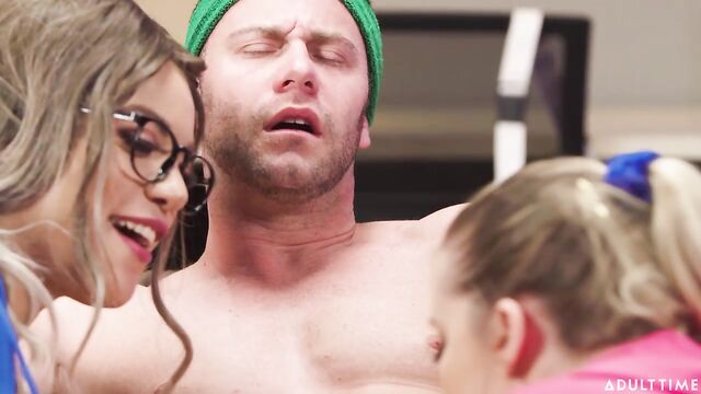 Description:A soccer player, Seth Gamble, is in need of some physiotherapy after a rough match. Amber Alena assigns her protege, Codi Vore, to soothe the client's aches and pains, but Codi catches sight of Seth's dick and decides to assist him in more ways than one.After Amber leaves the room to get towels, Codi takes out her impressive breasts, so Seth can put his face between them. She then sits on his face for even more fun, but then Amber returns from her towel run. Codi ducks under the table and milks Seth's cock from her hiding spot. Unaware of where Codi is, Amber assumes the coast is clear for her to have a little fun with Seth as well. Both women pleasure Seth until they catch sight of each other, turning this physiotherapy session into an unplanned threesome!