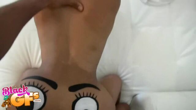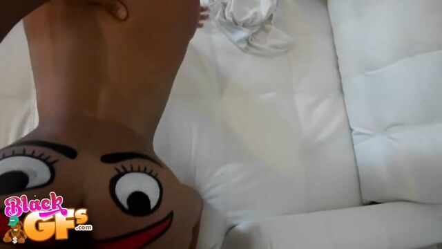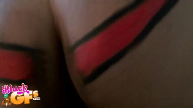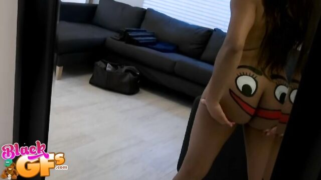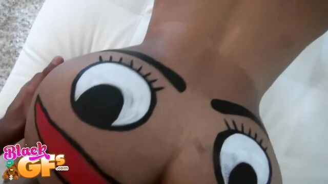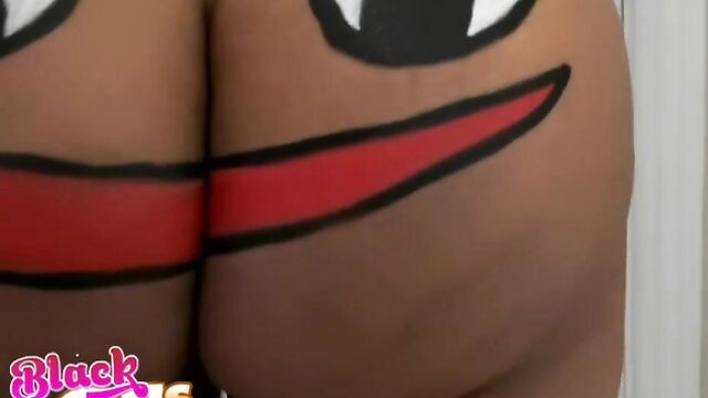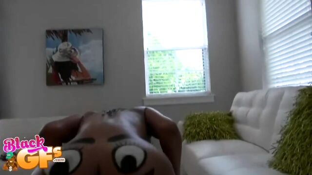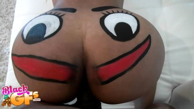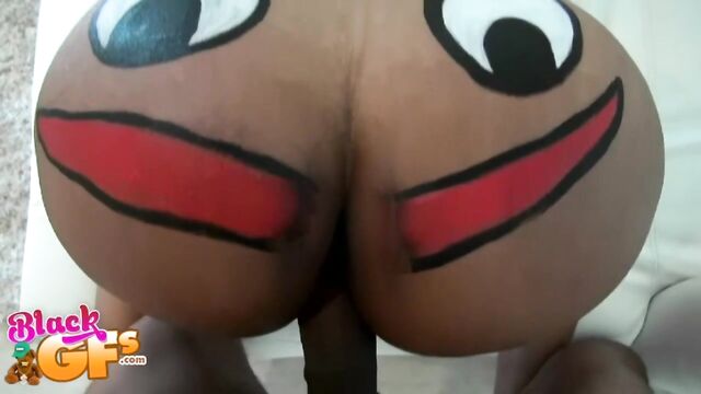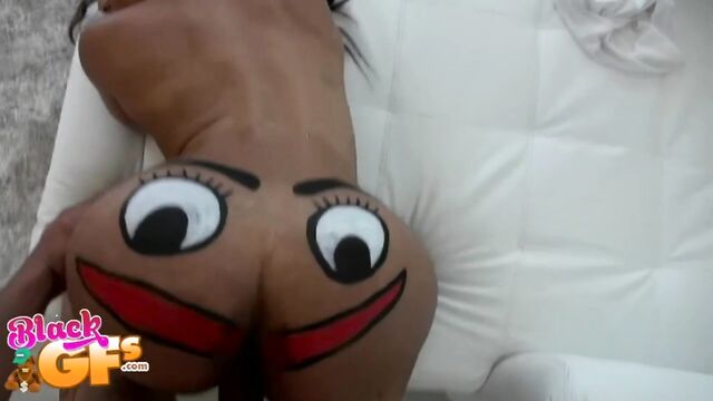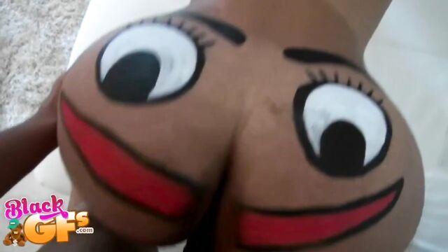 Description:Jayla was a black girlfriend with an ass like no other. This particular afternoon, she was feeling silly, so she painted a BIG happy face across that delicious juicy booty and pranced around the house naked. Little did she know that her man had a new camera and was wanting to test it out. The second he caught the view of his sexy GF running around the house naked, he had to film her. Jayla was super embarrassed and ran away. But no matter where she went, he caught up to her. She liked the chase, and it got her horny, so she started playing along and posing sexy for him. This ebony babe had a body that was insane. That ass was bubbly, perky and just bonerific. Before long, Jayla's BF was feeling it and had a full hard on. When Jayla saw that, she helped him out and started sucking and stroking his cock. They were both heated up by then and more than ready for sex. Jalya's BF banged that sweet ebony pussy deep and hard in doggystyle, as it bounced all over from the pounding. Then she got on top and rode that cock until he couldn't take it anymore. He pulled out and left Jayla with a sticky treat of jizz all over her sexy tits and pretty face. She just gave the camera a big smile and blew a kiss. You won't want to miss out on Juicy Jayla!