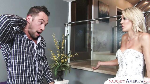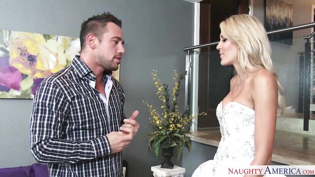 Description:Audrey Show just showed up with the dress for her sister's wedding. Johnny wants to make sure the dress is well taken care of, but Audrey decides to try it on herself. After trying it on she accidentally spills coffee on it. Johnny is going bonkers and he's ready to tell the bride about the dress, but Audrey convinces Johnny to lie about the stain in exchange for a great fuck session.