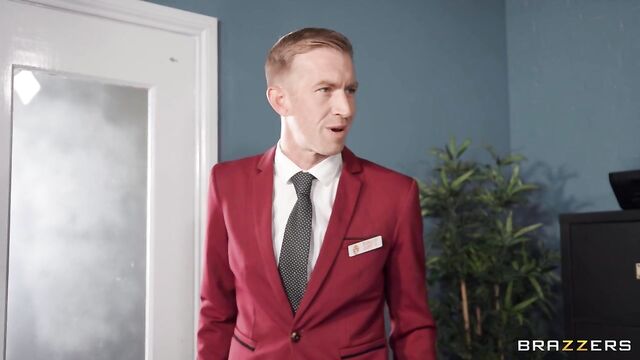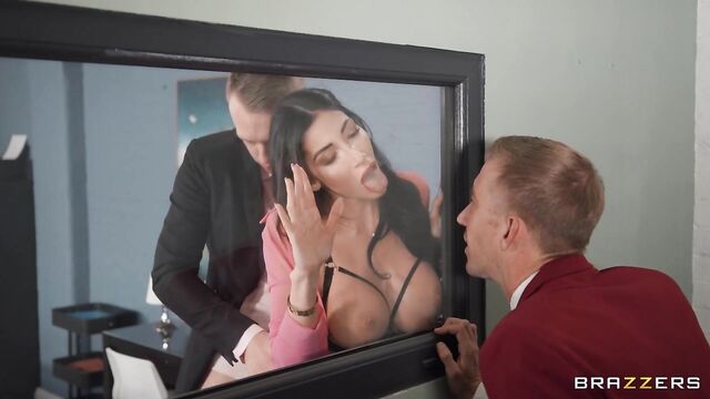 Description:Businesswoman Clea Gaultier and her husband, Chris Cobalt, have their sights set on Danny D’s No-Tell Motel. Although they appreciate the detail and care that’s gone into the motel, they believe that they can turn Danny’s business into a money-making machine. The pair arrive at the front desk and Clea, bored of waiting for Danny to arrive, decides to get frisky with her partner by showing off her tits and ass. Unfortunately for her, Chris isn’t in the mood and brushes her off while the voyeuristic Danny spies on them from a peephole. It’s evident that while they might have business acumen, they don’t have any spice in their relationship. But Danny, and his motel, are about to change that! He leads the pair into the boardroom and tells them that if they want to buy his business, they need to prove that they’re the right couple for the job, before ducking out to take a call. However, Clea realizes that Danny isn’t really gone, he’s just watching them from behind a two-way mirror! Wanting to prove they have passion, Clea and Chris put on a show for Danny. She pulls her top off and plays with her tits as she sucks Chris’ dick, before he fucks her roughly against the mirror for Danny’s enjoyment on the other side. Danny then returns to the room for some threesome fun. Clea lets Danny and Chris spit roast her, each taking turns getting their dicks sucked and fucking her pussy. Clea then has her ass fucked before getting double penetrated by their cocks. Sweaty and satisfied, Clea then sucks their dicks one last time before they cum all over her face.