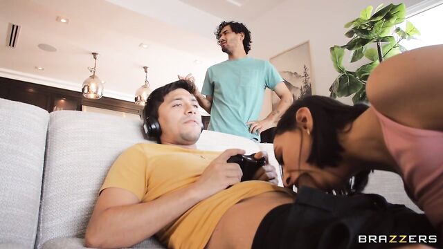 Description:Hailey Rose’s boyfriend, Rico Hernandez, is being inattentive despite her obvious advances, so she turns her attention to roommate Max Fills, who’s gaming. When Hailey flashes her big natural tits, Max is immediately turned on, leading to sneaky sex right under Rico’s nose. Although Max busts a big load that drips from Hailey’s pussy, she slips away undetected to wash off in the shower. Max, though, isn’t done, and he follows her in and starts fucking her again. A hot, wet shower fuck gets interrupted when Rico comes in looking to join Hailey, only for her to distract her boyfriend with a blowjob while Max keeps fucking her behind the shower curtain, undetected. Hailey knows how to multitask and get what she wants, but the question is whether she can get away with it.