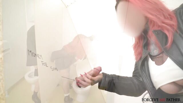 Description:We saw this couple fighting in a car, and the guy kicked the girl out to the street! We approached to offer her help but she did not want it. She wanted to go to the toilet, so we snuck into the bathroom behind her knowing that the stall had a gloryhole. I put 100 euro on my dick and stuck it through the hole, and the woman happily started to give me a blowjob. For more money she let me fuck her, and I kept slipping out because she was so wet! She had huge tits and took my cum in her mouth, then went back to her boyfriend like nothing happened.