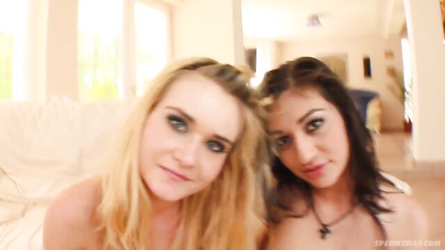 Description:Two incredibly hot chicks are paired up for a session of sex. Their pussies get pounded before swapping a massive load of cum from one to another.