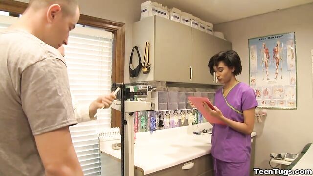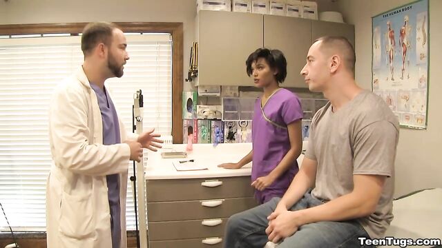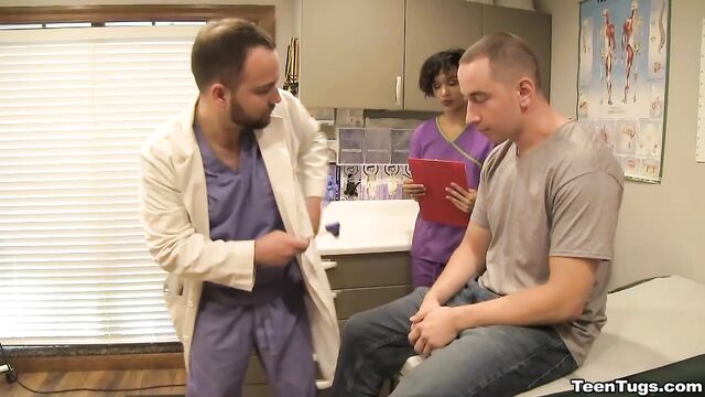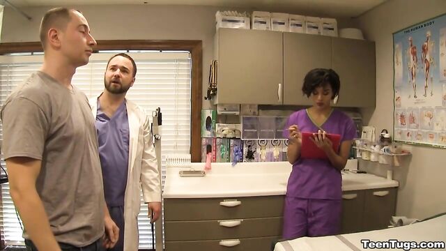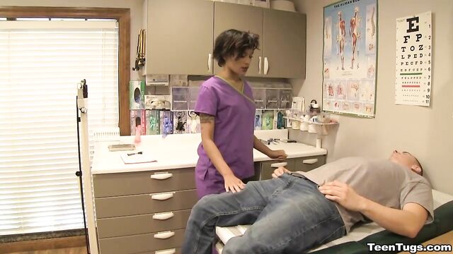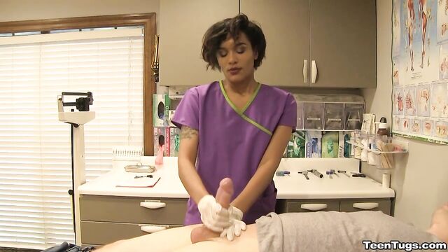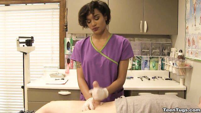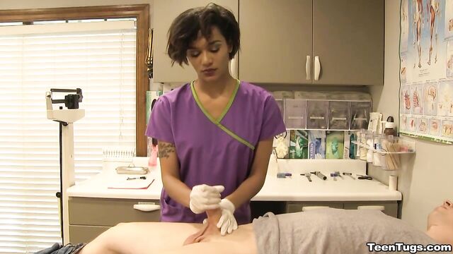 Description:John is in for his exam when the doc steps our for an emergency. Luckily Nurse Barnes is available to extract the needed samples. She pulls out his hard cock and milks him with latex gloves, stroking his hard cock until he accidentally explodes his semen, shooting his goo over his shirt. Nurse Jasmine believes shes has enough for a sample.
