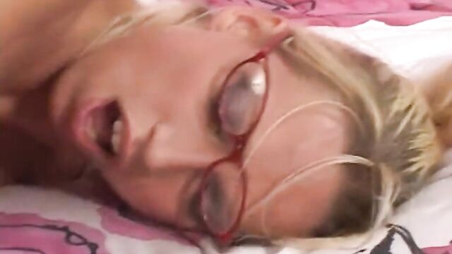 Description:Sexy blonde slut Nicki Hunter is dressed in her school uniform and sexy glasses. She is lying in beds reading, she slowly starts to caress her firm breasts until he interrupts her. She can't help but rub his strong chest and strip him of his shirt soon she is stripped of her blouse, revealing her beautiful breasts. She slowly starts to suck his big hard prick, she lifts her skirt to reveal pretty white panties which she soon takes off to show him her shaved snatch. Nicki climbs on top of his hard rod and allows him to enter her tight pussy, then she gets on all fours and he pounds her doggystyle. He finishes up by glazing her pretty face with his hot cum.
