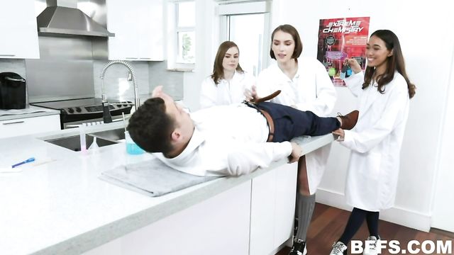Description:Absolutely irresistible schoolgirl Natalie Porkman is super excited to get into her lab coat with her besties, Aria Skye and Riley Grey. The nerdy nubiles sharpen their chemistry skills by mixing some strange concoctions when our stud shows up curious about their nasty experiment. The girls reveal they have come up with a potion that will create a four hour erection! They apply it to the lucky guys boner and share his prick, sucking and slobbering on it before taking turns enjoying cunt filling cock rides. Then, they tease a beakers worth of cum from his stiff wood. Turns out the potion works after all!