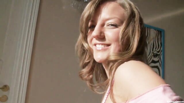 Description:This gorgeous blond college babe is just too fucking hot! Sunny struts onto the scene wearing a tiny skirt and singlet, bending over at the waist to give you an incredible view of her pantie clad ass. The skirt rides up over her hips, with a little gstring barely covering her firm, bald pussy and disappearing between her large ass cheeks. This girl really knows how to tease, and you will be able to masturbate to completion just by watching her strip. However, things get even hotter when she pulls out a glass dildo with a large, elaborate handle, squatting down with her legs spread and taking the thick dong into her shaved fuck socket.