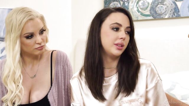 Description:A lesbian couple, Kenzie Taylor and Bella Rolland, are surprised to discover that an unfamiliar young woman is inside their pool cabana. Kenzie is upset at first, but Bella points out that maybe this person needs help, and suggests they should talk to her. The couple approaches the young woman, Whitney Wright, who is clearly distraught and has nowhere to stay. The couple invites her into their house, saying she can freshen up and take a shower.After showering and changing into fresh clothes, Whitney looks like she's feeling a bit better. She thanks Kenzie and Bella for their kindness, and they ask her if she wants to talk about her situation, promising they won't judge her. Whitney explains that she used to live with her boyfriend, but when he snooped in her private journal and found out she was starting to have dreams and fantasies about being with women, he was furious and kicked her out of the house. Kenzie and Bella are sympathetic, and Kenzie says that when she first came out as a lesbian, her family kicked her out too.Kenzie and Bella agree to let Whitney stay for as long as she needs. Bella moves closer to Whitney to give her a comforting hug, and Whitney is so moved that she kisses Bella. Kenzie and Bella are surprised, but Whitney admits to a long-held fantasy of being cared for by an attractive couple. Kenzie and Bella decide to guide Whitney through her first lesbian sex encounter, which leads to a unique three-way experience and a newfound polyamorous relationship. Welcome to your new home, Whitney!