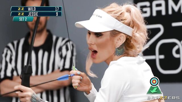 Description:Professional athletes Sarah Jessie and Zac Wild go toe to toe in an intense archery match! Fit blonde saboteur Sarah strokes, sucks, and fucks Zac while he aims for the target. Zac manages to hold his own until Sarah pulls a shiny butt-plug out of her ass, replacing it with Zac's huge cock. Will Zac go for gold, or will he risk it all for a chance to peg Sarah's tight little bullseye? Find out on The 2020 Brazzers Games!