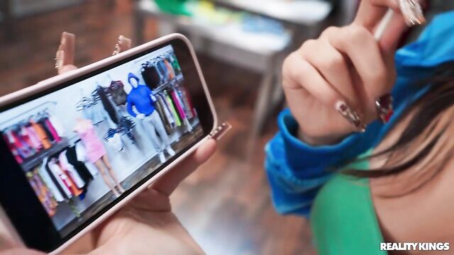 Description:Violet Gems and James Angel have planned a peak prank, as long as they can distract boutique owner Lilly Hall. Violet sends Lilly to search for a size in the back room and James hurriedly puts on a mannequin disguise to scare some shoppers. Their video goes so well, Violet decides to have some more fun sucking her BF's cock, but when Lilly catches her she chases James out and drags Violet into the changing room to spank her! She licks the prankster's pussy and tells Violet to get on her knees and work to make up for what she did. It's no prank as the babes 69 and scissor in the fitting room.