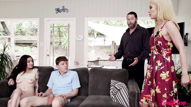 Description:What would happen if four families each contributed one member to create a new family? In this episode of Family Swap, swap siblings Rion King and Leia Rae are feeling some sexual tension as they enjoy some family time by playing a board game. Their swap mom, Tiffany Fox, warns the kids that they're going to act like a real family, but as soon as she leaves to take a shower the kids' swap dad, Jack Vegas, lets them know he's cool with their flirtation since he's hoping to get with his swap wife in a biblical way over the weekend. He just wants them to understand that they need to keep it hidden from Tiffany since she takes the swap seriously. With dad's blessing, Rion and Leia get busy with each other. When Rion pops Leia's big tits out of her top, Jack claims that he's uncomfortable and pretends to leave when in reality he just gets out of sight so he can watch.Soon enough, Rion has his hands down Leia's panties so he can diddle her clit. She pops Rion's cock out so she can get on her knees and start sucking. Rion waits until he can't take it any longer and shoves Leia onto the couch so he can eat her out until she's nice and wet and ready to slide down on his hardon. Slipping his hands beneath Leia's ass, Rion helps hold her in place as she rides his fuck stick. The kids barely even notice as Jack returns and asks them to cut it out for a bit since he's just been kicked out of the bedroom since Tiffany doesn't want her seeing him naked. Before Jack can try again, Tiffany walks out and catches them in the act. She freaks out, but Jack calms her down by kissing her on the neck and giving her the affection she's craving. When Tiffany capitulates, Jack tells the kids to come over so all three of them can give their swap mommy the attention she's been missing.With her whole swap family coming together to make sure she's feeling loved, Tiffany begins to unwind and open herself up to the family orgy that's building. Leia gets to enjoy dad dick in her mouth while Rion eats Tiffany out. Then Tiffany gets to have Rion pounding her pussy while Leia rides Jack's hardon. Climbing onto her knees, Tiffany gets double stuffed as she sucks Rion off and has Jack pounding her from behind. Leia can't help but masturbate at the hot sight. Until she gets to lay down and let daddy take care of her while Tiffany rides Rion. Jack pulls out to cover his swap daughter in jizz as Rion creampies his swap mommy. The swap siblings may have started out only into each other, but it turns out that playing with the whole family is lots of fun.