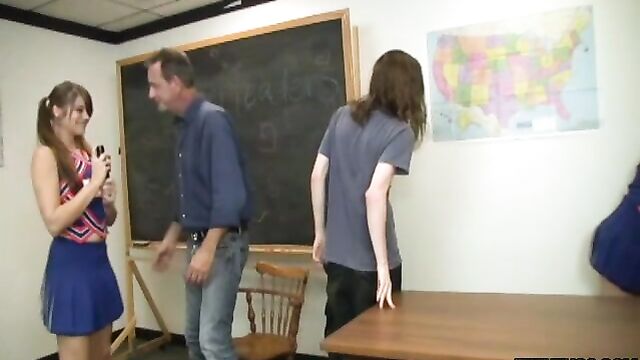 Description:Delinquent teens Pocahontas and Dakota Charms need some extra credit. They taunt and tease Mr. Johnson and beg him for some extra classwork. While there young stud Connor is jamming on his guitar when the two teens offer handjobs to both of them. Pocahontas and Dakota take turns and race to see shoe can nut first.