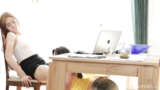 Description:Stunning redhead Jia Lissa appears to be utterly focused on her work, but all is not as it seems. As Sandra Shine’s hot lesbian movie "Business Or Pleasure" – inspired by a true story by Tabitha Lowndes on MyErotica.com – begins, the camera pulls back to reveal cute brunette Hayli Sanders under the desk, eating Jia’s pussy hungrily. Jia is stressing out over a video call when Hayli decides to distract her in the sweetest way possible, tugging her panties aside to reveal the strip of natural red hair that leads to her pussy. Jia becomes breathless and confused as Hayli licks her, until at last her boss ends the call and she is able to concentrate fully on pleasure. Taking off her panties and tugging at her nipples, Jia moans with arousal as Hayli’s eager tongue gives her an intense orgasm. Now Hayli lets her shorts drop and sits on the table with her legs spread so Jia can repay the favor. Jia sucks and licks her girlfriend’s diamond-hard nipples eagerly, then gazes up at her as she laps at her shaved pussy. Hayli arches her back, squirming in ecstasy as Jia fingers and eats her to an overwhelming orgasm. But there’s another surprise in store for Jia…