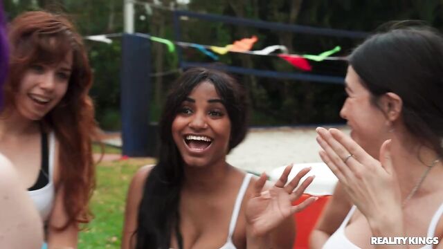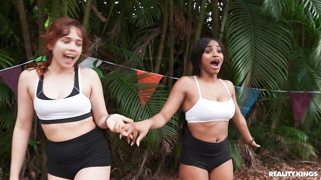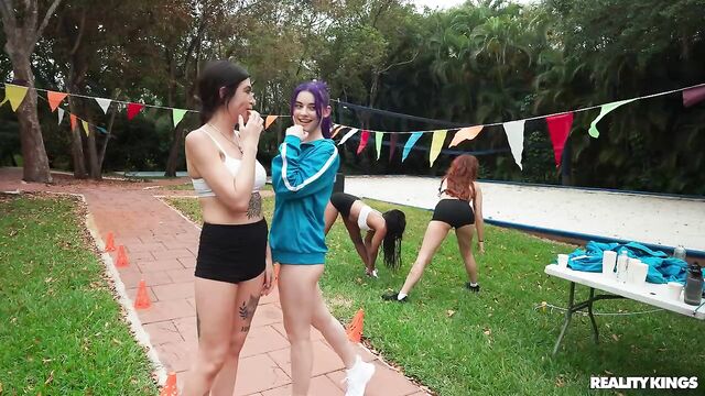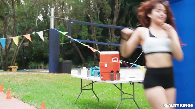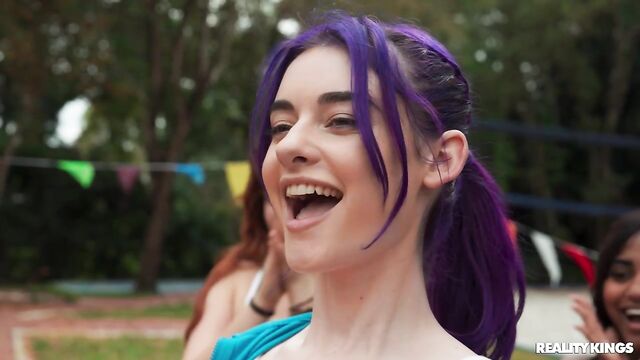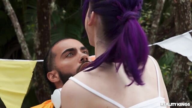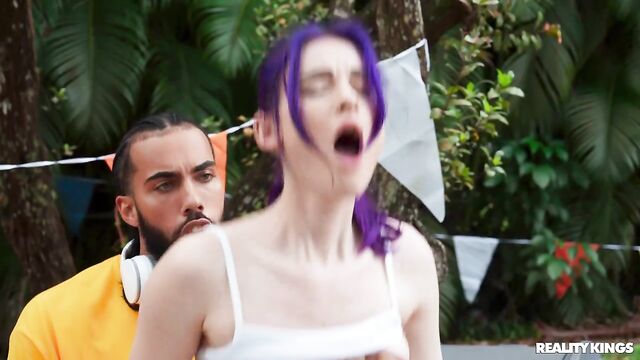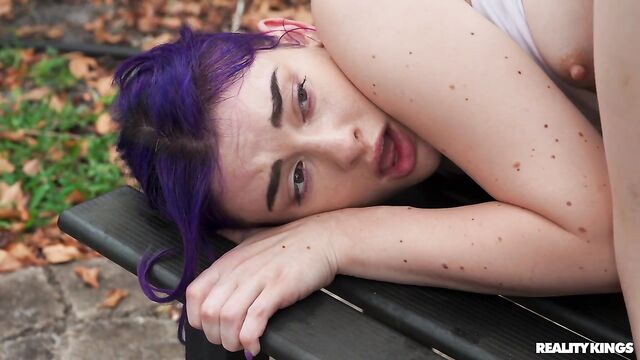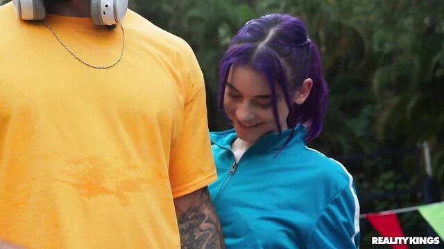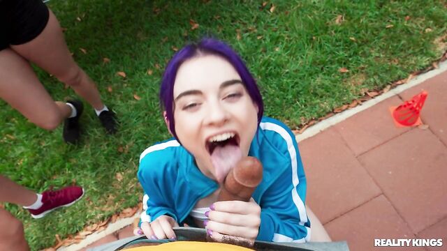 Description:It's race day, and the girls of the track team are getting pumped, especially petite, purple-haired Spiraling Spirit! Spirit is full of energy, pulling down her track pants to show off her tight booty in her running shorts, and playing around with her teammates. When she sees hot athlete James Angel nearby getting warmed up, she takes out her perky little boobs to show him, and sucks his baton in front of her friends! Spirit hits the trail and James follows to a secluded spot where they can fuck on a picnic table. Spirit takes a facial, then it's back in the race!