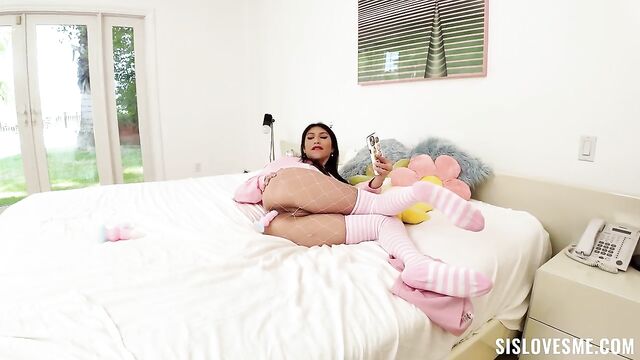 Description:Penelope loves being a slut, it doesn’t really matter who she’s being a slut for, but the adrenaline of being one excites her to no end. She loves fucking strangers and teasing everybody, and that includes her stepbrother, Elias. She keeps sending him pics of her gorgeous ass and he keeps telling her to stop because she might get him in trouble with his girlfriend. She doesn’t care and she keeps doing it, even walking around the house with her perky little tits out for him to see. When he confronts her, she notices he has a boner in his pants, so she drops to her knees to suck his cock. His girlfriend calls him in the middle of the blowjob, and she makes it extra sloppy for her to hear. Elias gets really scared and leaves the room in a hurry, terrified and horny as hell. That same night he goes into her room ready to hate fuck the shit out of her ass, the one she loves to tease him with. He teases her hole with her dildo before she gags on his big cock again. She then rides him with her tight hole and begs him to pound her hard and deep until he cums all over her gorgeous ass!
