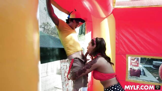 Description:Ricky sneaks into a weird carnival filled with strange attractions. The carnival master greets him and shows him the different games he can play if he truly believes. The best of all is the prize: meeting the beautiful Anastasia. Ricky wins every contest without any problem, only to find out the lovely Anastasia is a dude. Bummed, he moves on to the next attraction: Bella, the strongest woman on the planet. The ripped milf is lifting some weights when she meets Ricky. The boy is instantly attracted to her, but he’s no match to her strength. However, the boy will get his chance to feel her ripped boy when he competes against her in a friendly wrestling match in the bouncy castle. Bella has no mercy on him as she manhandles Ricky and takes him on the ride of his life. Lucky for him, it involves lifting the boy to suck his hard cock and letting him pound her strong pussy for the big finale.
