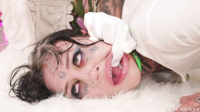 Description:Lithe, well-inked brunette alt-girl CC Doll sends some sexy selfies, hoping for a hookup. The slim siren pulls down her jeans, showing off her tiny white panties and tight butt. Mustachioed, dominant stud Nade Nasty answers her call. He spits on her, and they kiss. Nade unwraps her like a gift box, pulling up her white halter top to suck her tiny tits and then sliding his fingers into her slit. The dark-haired, doe-eyed babe drops to her knees to suck his hard cock. She gives a deepthroat blowjob, choking. CC salivates on a pink dildo as Nade's prick pounds her snatch. He slams her tight gash doggie-style, CC still slobbering on the toy and drooling into a large glass bowl. Anal fucking makes CC's butthole gape. Nade pokes his prick into her mouth for a raunchy, ass-to-mouth clean-off! She rims Nade's bunghole. The lewd action climaxes when Nade pumps a spermy load onto CC's forehead. Gravity pulls the mess down to her lush lips and onto her cute braces, leaving the hip chick decorated in a cum facial.