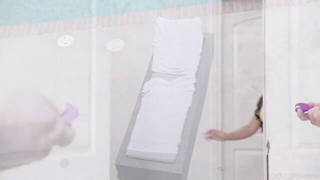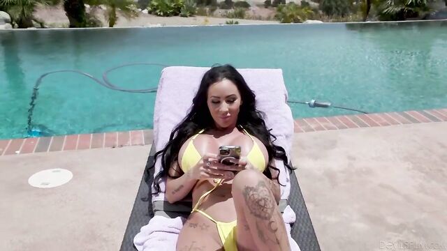 Description:Danae Mari is lounging by the swimming pool in a sexy yellow bikini. Her boyfriend GI Joey says he's going to the store and asks Danae if she needs him to get anything, but she says she's fine. After Joey walks away, Danae mischievously pulls her bikini bottom aside to reveal that she's pleasuring herself with a vibrator! The sex toy has a remote control, so she presses it to play with the intensity of the vibrations, gasping with delight.However, unbeknownst to her, Joey hasn't left for the store yet, and sees Danae pleasuring herself from the balcony. When Joey does come back from the store a little later, he goes to the pool to tell Danae that he's back, and sneakily grabs the remote control before going into the house. From there, Joey mischievously uses the remote to increase the intensity of the sex toy's vibrations, watching with amusement as Danae gasps and moans from the increased pleasure.When Danae realizes what's going on, she races into the house and playfully shoves Joey onto the bed, saying her pussy is super wet now, so he'd better finish what he started by fucking her!