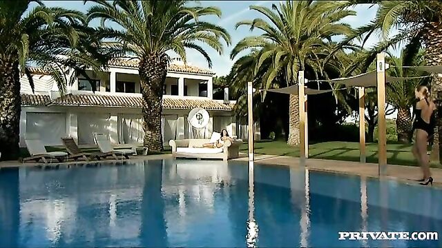 Description:Eufrat and Keana Moire share this scene that takes place outdoors near a pool. After kissing one girl lays on her back with her legs spread while the other finger fucks her with a gloved hand. She double penetrates her and keeps it going fast until her lesbian friend has a mind shattering orgasm.
