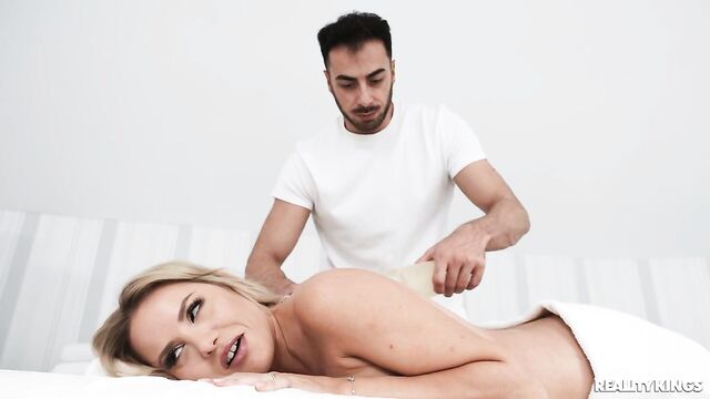 Description:Blonde Maya Rose tells masseur Francis X that she had a hard week, and she'll show him her tense spots. Maya isn't shy to get fully naked and lie down on the table, and after Francis starts with her feet and legs, she flips over and asks him to massage her big tits! Francis is happy to oil up those beautiful boobs, and then he gives her a firm pussy massage, both rubbing her clit and putting his fingers inside. Maya sucks the masseur's big cock, and he eats her pussy and fucks her feet before finally giving her the deep fucking she needs. Tension? What tension?