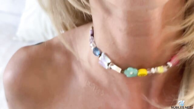 Description:Although blonde spinner Emma Rosie may look angelic in white, this cock loving coed is no angel at all as her clothes come off. She wants you to look your fill at her tan lines and small titties with their pierced nipples, then watch as she uses a vibrating dildo to make her bald pussy cream.