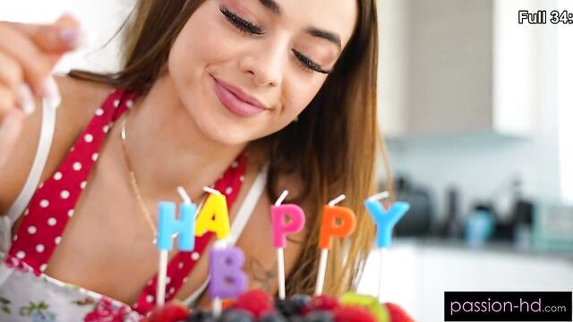 Sexy girlfriend wakes up early to surprise her boyfriend with a birthday cake. He comes into the kitchen for a slice of cake and pussy!