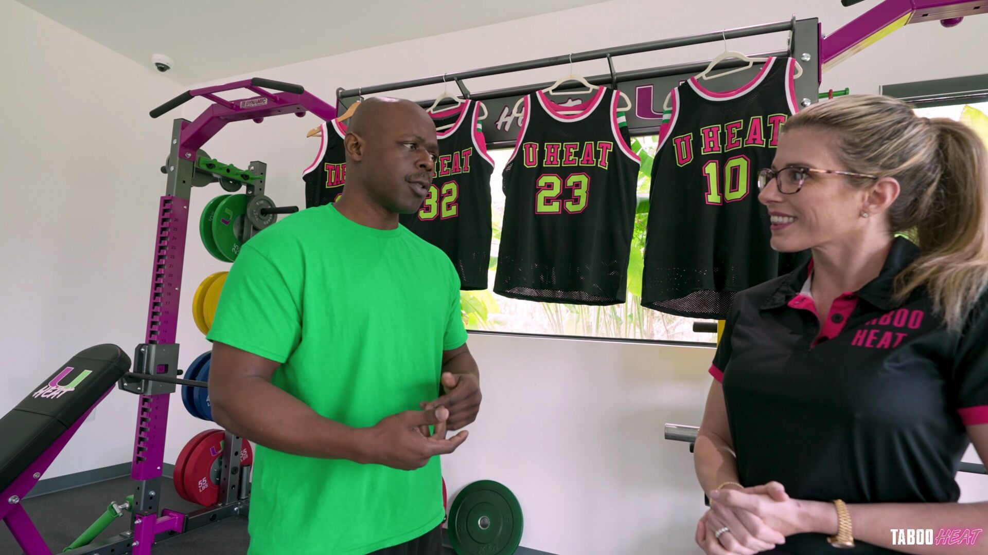 Description:Cory Chase is showing Will Tile around the gym this morning. 'Do you think you have what it takes to join our Championship team?' Cory asks him. 'Oh yeah, I'd give it 110% every day!' he tells her. Cory isn't sure about him, so she wants him to prove that he will be a good asset to the team. She slowly lifts her shirt up, revealing her big, enhanced tits. 'I'm not just talking about the basketball courts. I need to make sure you have what it takes behind the scenes as well,' she tells him, as she pulls her shorts down to the ground. Now that she's completely naked, she tells Will that this is exactly how she motivated the rest of the team to win the championship! Will is now starting to understand, and he also takes his clothing off as well. He sits down on the weight bench and Cory starts to give him a blowjob. She sucks his cock and she even titty fucks his big cock. Then she moves into the doggystyle position and Will eats her pussy out from behind. While she is still in that position, he starts to fuck her pussy from behind. He picks her up and he continues to fuck her pussy while he's holding her up in the air. She climbs on top of him and she rides his cock in the reverse cowgirl position next. A few minutes later, she flips over into the cowgirl position. She then stands up and leans against the rack of weights, while Will keeps fucking her pussy. Then she gets down on her knees and puts his cock in her mouth...