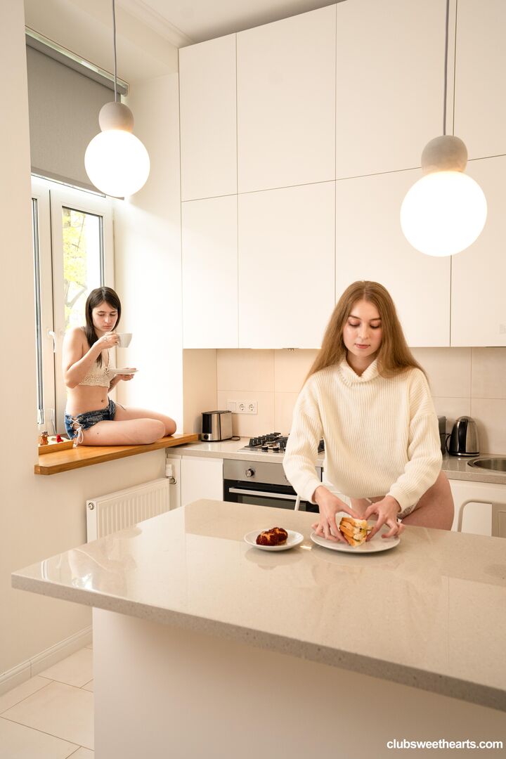 Description:In "Espresso and pussy before breakfast" Bonnie and Lexy are in the kitchen, making coffee and flirting really cute and sensual. A few sweet kisses turn into hands under skirts, and soon they forget all about coffee. Lexy’s hairy pussy gets some sweet licking, while Bonnie’s smooth one gets fingered and teased. They laugh, moan, and scissor right there on the counter. Now that's how you start a morning!