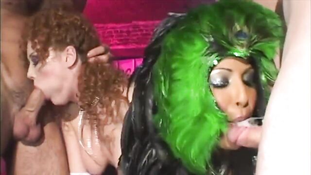 Stunning babes double penetrated and covered in warm cum in hardcore orgy.