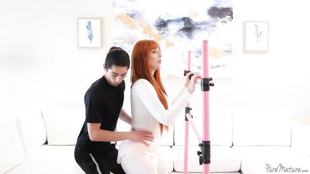 Sexy redhead cougar seduces her ballet instructor.
