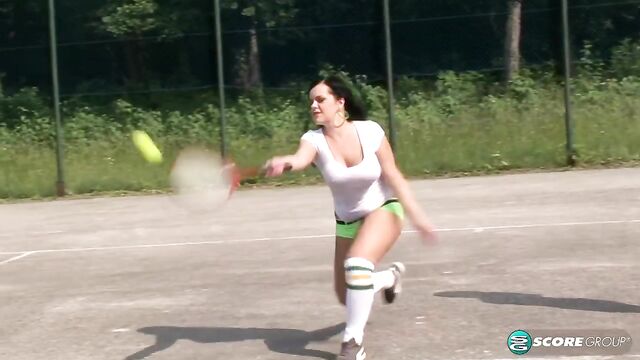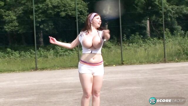 Description:Karina met Mandy Pearl, an F-cup newcomer from England, while on-location in Budapest, Hungary, to film the DVDs Hooter Hotel and Busty Riding Academy. They immediately hit it off, and when we suggested that they head outside for a game of big-boob tennis, the girls giggled, grabbed their racquets, grabbed their racks and ran outside. Our reporter at the scene described it this way: "Karina gives us a jiggle and a giggle and bounds back over to her side of the court to hit some balls for video. We get so caught up in the tit-tennis that we don't see Mandy come onto the court. "How do I look?' Mandy says with her crisp British accent. Does this make my tits look nice? "We turn around, and Mandy is in a sheer, white t-shirt that is stretched so tight over her pretty titties that we can clearly make out the outline of her areolae. She asks us if she should shake her tits for us, too, and we almost clap in anticipation. All these tits are reducing us to mush. And then the girls are playing tennis, and although Mandy has some skills, we don't care if they hit the balls or not. We just want them to keep running and jumping around. But the muggy weather gets the best of them, and within minutes they are hot and sweaty. And then we hear the words we've been waiting for "Bring out the water balloons, says Peter, our photographer, and the girls laugh and jog over." Gentlemen, we know that it might be very cold right now, depending on where you are. But if this video doesn't warm you up, nothing will.