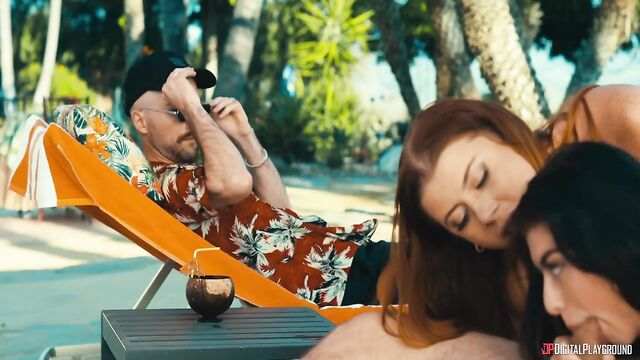 Description:After his joke proposal went down like a lead balloon, Andy (Nathan Bronson) spends the night on the floor. Jess is horny and starts the day by touching herself without any need for him, so Andy stalks off to sulk by the pool. His bad mood doesn't last long once bikini-clad hotties Lola (Stella Luxx) and Ginny (Gal Ritchie) sit down next to him and ask him to oil up their backs... and booties! The babes toss their tops at him and slip into the pool, telling him to join them for a threesome. Andy's finally in the vacation mood as he bangs both babes... until Jess catches him. After Andy learns about his girlfriend's tryst, the angry couple each resolve to fuck everyone in the resort!