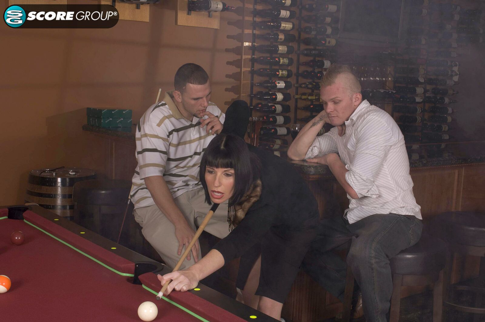 Description:In this classic remastered scene from 2008, Audrey Maxx, who was 40 years old when this scene was shot, is a pool hustler, and her target is two young guys sitting at the bar. She says she'll tell them what she wants if she wins, and when she does win, she says, "I think I'd like to have you both at the same time." She means right then and there, at the bar.