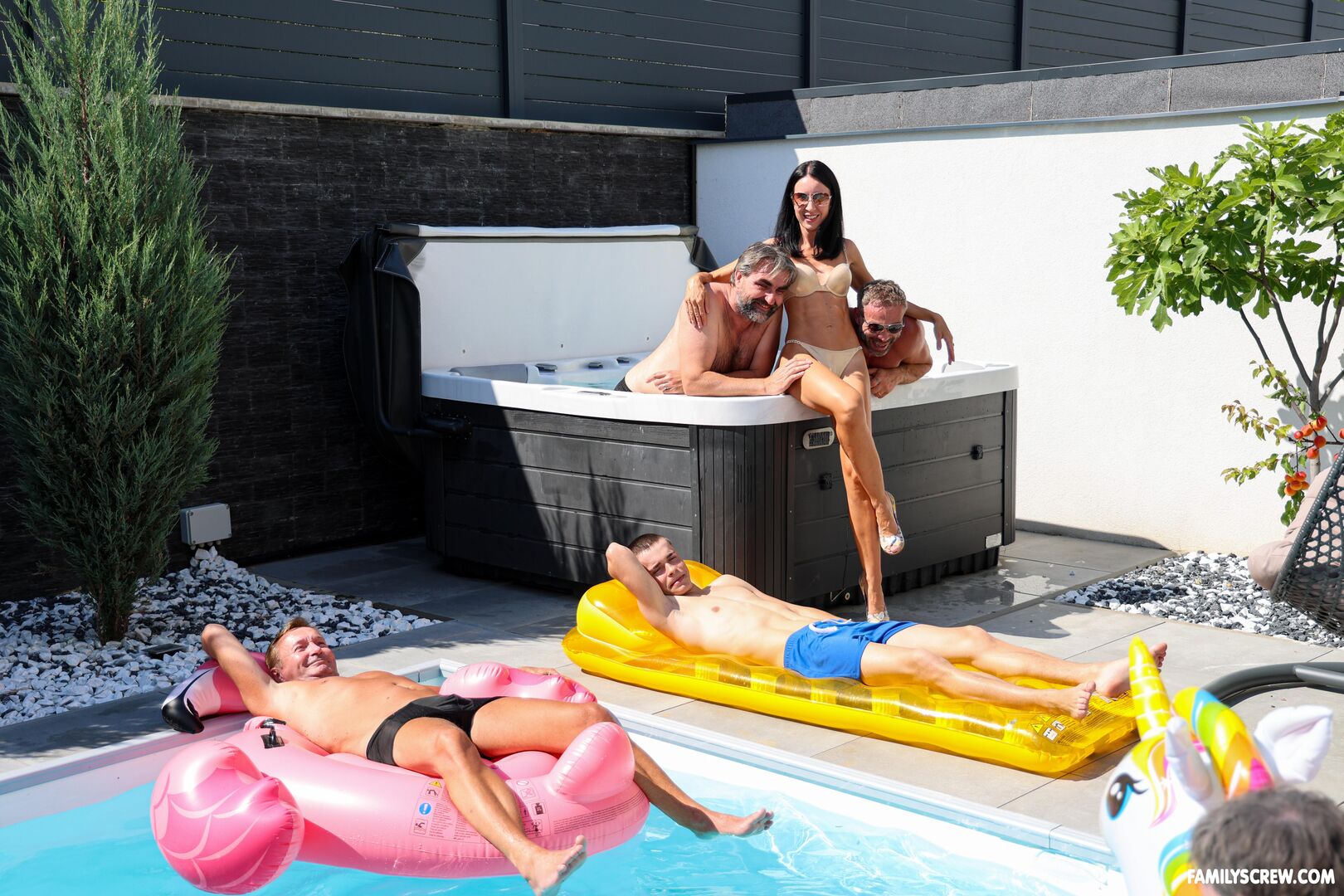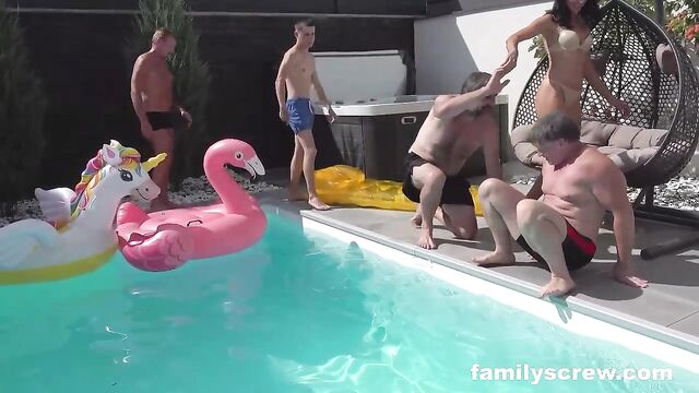 Description:Megan Love, a sultry brunette teen, craves kinky action by the pool in her skimpy bikini. Joined by MILF Linda Caprice in sexy lingerie and heels, they dive into a raunchy group bang with horny old studs Peter Stallion, Milan Nowak, George Wite, Dave Heart, and Lucky Cock. FamilyScrew delivers raw, hardcore fun as these petite hotties get their tight pussies licked and pounded. Blowjobs flow, and the steamy session ends with dripping creampies. This taboo step-family romp is wild, dirty, and packed with lust, leaving everyone soaked and satisfied by the shimmering poolside.