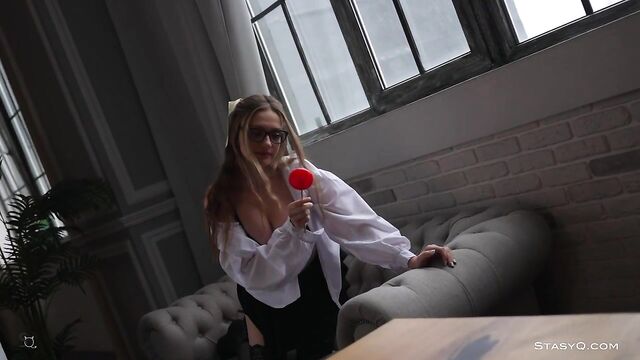Description:If you are into sexy secretaries, you will love Video Release 664. The ecstatic striptease features Rita Fizzi, a stunning StasyQ model. She stands out for her elegant beauty and a touch of fetish that makes her unforgettable. All sexy and naughty, Rita Fizzi appears wearing a black skirt, matching stockings, a white shirt, and nerdy glasses. She sits in a leather chair while wrapping her sexy lips and tongue around a popsicle. It's not long before she takes her bra off and begins teasing her pink nipples with the sticky candy. Her eyes stay fixed on the camera as she continues to undress. If you stay long enough, you'll see the feminine goodies hidden beneath Riza's cute skirt. The gorgeous brunette will take her panties off for your eyes only, but that's only the beginning. The unique masterpiece won't stop until you have your share of naughty fun.