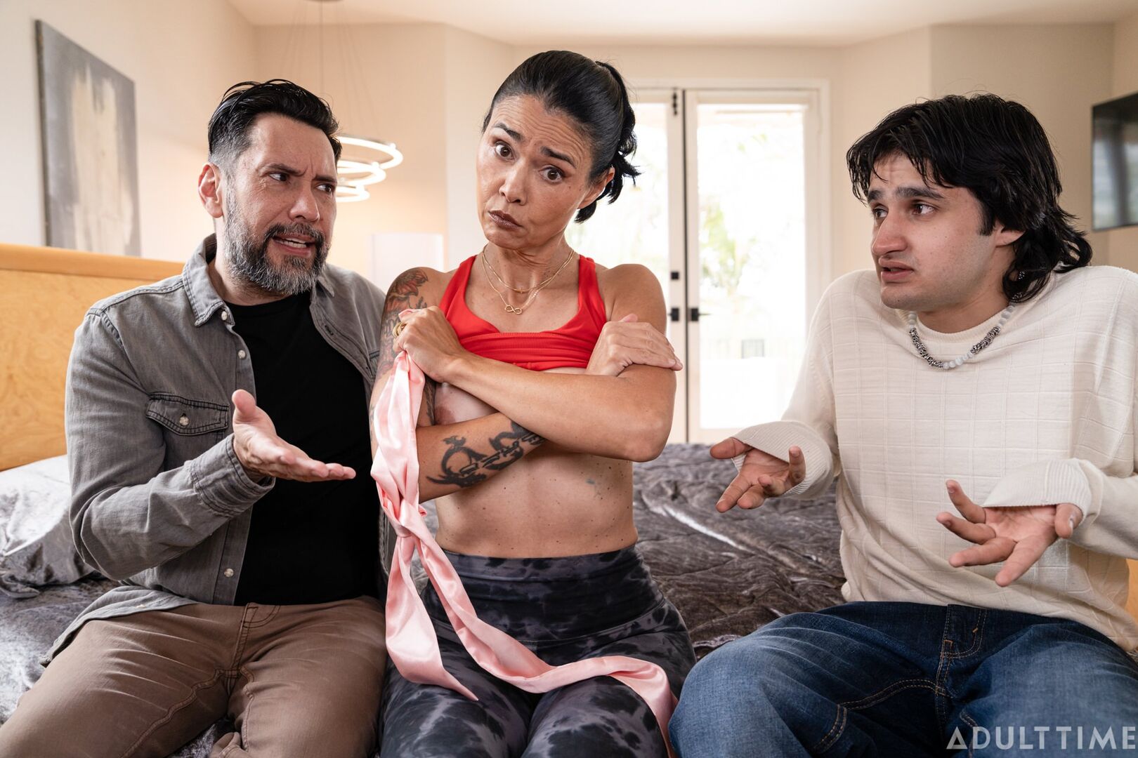 Description:Carl (Tommy Pistol) is approached one day by his stepson Thomas (Elias Cash), who wants to borrow some money. It turns out that Thomas wants to lose his virginity, so he's thinking of hiring a call girl to help him with the task. Carl won't support this sort of idea, but he wants to help his stepson, so he comes up with a slightly unorthodox plan to get Thomas what he wants. He leads Thomas up the master bedroom, where Thomas' stepmom Brandi (Dana Vespoli) is lying naked on the bed with a blindfold over her eyes. Brandi has been waiting for Carl to come up and give her a naughty massage, but she won't know the difference if Thomas does it in his stead! Thomas agrees to it and proceeds to fuck his stepmom, only for her to take off the blindfold at one point and become shocked when she sees that it's her stepson fucking her. But with a little buttering up from her darling husband, Brandi decides to keep going, letting Carl and Thomas DP her in a steamy, energetic threesome.