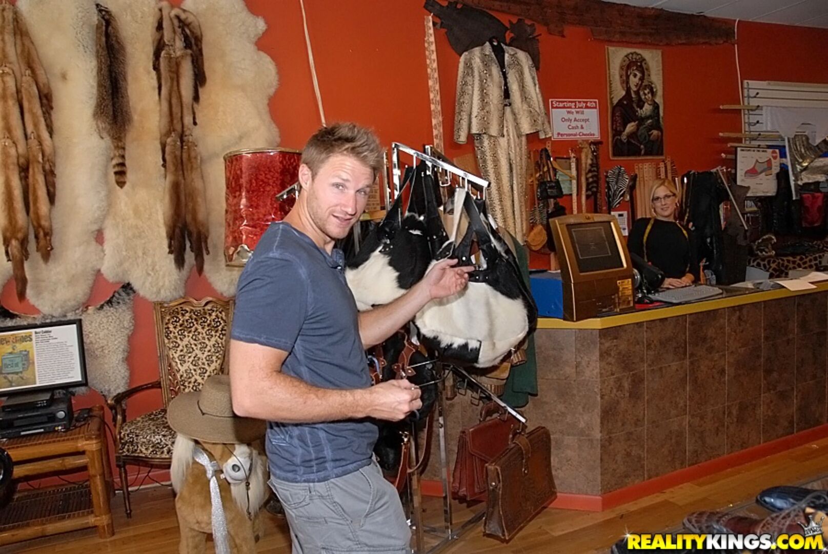 Description:Levi told me about Anamarie, a cordwainer who ran a leather shop with her estranged husband. Levi had dropped off a couple Iguanas he had hunted and he wanted to make boots out of them so he could look spiffy when we go to our favorite country bar. He noticed her flirting with him even though her hubby was hard at work in the back of the shop. Right behind his back, she was really pouring it on so he figured he would make a play for her. He called early and found out her hubby would be out for the day and he rushed over there with me in tow to pick up his new iguana skin boots. They picked up right where they left off and we closed the shop for them to finally knock boots.