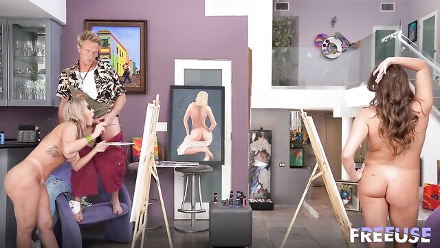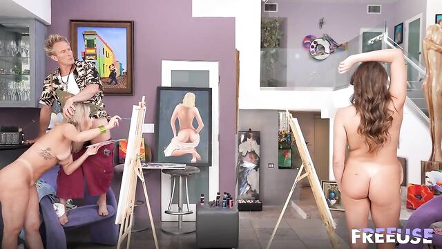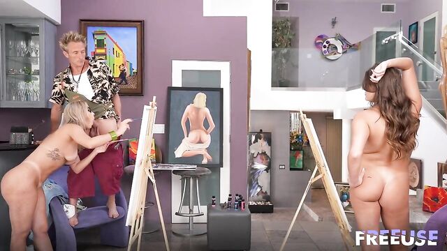 Description:I've never taken a live nude painting class before, and I really wanted to, so I convinced my stepsister to join me, but our class was a little bit... different. First, the model canceled at the last minute, so the teacher asked me to step in and model for my stepsis. I considered saying no, but taking off my clothes for something like this felt artistic and classy, so I did it. Then, as she was painting every inch of my naked body, the teacher started touching me, lifting my boobs, opening my pussy, and squeezing my ass, so my stepsister could see me from every angle. I wanted to paint too, so we convinced my stepsister to get naked as well. I didn't realize how hot my stepsister was until I had to capture her perfect tits on canvas. Could she tell how much I wanted to lick her pussy from my painting? The teacher discussed art as we both took turns sucking his hard cock to get inspired. Turns out we both paint better when we're horny and about to have an orgasm, so using a brush while riding the teacher's dick was the perfect combo.
