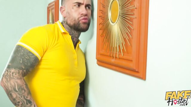 Description:Attractive couple Sexy Nala and Nestor Zarc visit a meditation guru (George Uhl), who wants to fix their karma. Raven-haired babe Nala soon gives in to George’s persuasions, and they passionately kiss! As Nala’s boyfriend meditates in the next room, grey-haired hunk George instructs Nala to kneel down and suck on his rock-hard cock. Following a sloppy, deepthroat blowjob, the big-boobed hottie plants her pierced pussy on Steve’s face for a tongue fucking before riding him in cowgirl, her huge fake titties jiggling around as she bounces! Next, the horny duo enjoy an intense side-fuck on the floor, and then inked-up Nala sticks out her curvy ass to take a hard pounding from behind in doggystyle. Once Nala has finished banging Steve, she returns to her cuckolded boyfriend and continues the fun with him! Straddling the tattooed Spaniard, Nala moans loudly as Nestor plays with her juicy bubble butt, and then the muscular stud fucks his girlfriend in missionary as George watches on until the voluptuous cumslut is covered in both of their loads!