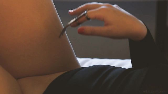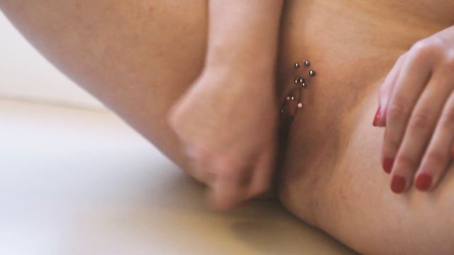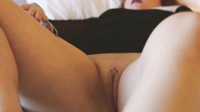Description:Stunning redhead Kim Cums arrives at a cheap hotel room, elegant in a little black dress, skyscraper platforms with spike heels, and red lipstick. She slumps back on a single bed with plain white sheets, takes off her shoes to reveal cute bare feet, then lies back, rubbing her tits through the sheer top half of her dress. Within moments, she hikes up the skirt to expose a shaved, pierced pussy. She also puts on a kinky-looking finger-ring, tipped with two long, angled metal spikes, and tests these "claws" against her other manicured hand. Then she strokes the metal points against her thighs and splays her legs to flaunt even more pussy piercings as she moans with pleasure. She runs her finger along her slit, then strips off her dress to display a peachy ass. She lays a double-sided paddle, dildo and the claw-ring on the counter-table, then sits on it and takes off her bra to display pert, perfect breasts with multiple nipple piercings. As she massages her globes and tugs on her nipples, she talks dirty to herself, confirming her fetish for pain. Next, she uses the ring to tease them, pressing the spikes against her sensitive flesh as her fingers get busy in her pink. In need of a tender interlude, she takes the paddle and caresses the soft, fake fur-covered side, while talking to an imaginary Master. Obeying his orders, she turns around and begins to spank her butt, counting each stroke as it lands. Then she flips the paddle to use the harsher, metal-studded leather side. Soon, her cheeks are glowing pink and her juices are flowing Now, she takes her dildo – clear pink glass and double-ended – and talks dirty to "Sir" once more, as she plows her smooth snatch which is audibly and visibly creaming. Then she switches to using her hand to spank and rub her clit, pausing only to taste her juices off of her fingertips before she begs to cum. Clutching at her throat she teases herself to the brink of climax – then proves herself to be a good submissive by thanking her Master, even as she loses herself in the ecstasy of orgasm...