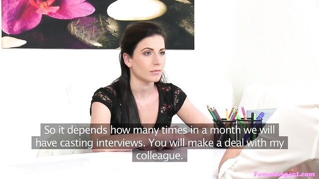 Description:I was late arriving at the office and I was surprised to see a gorgeous young woman waiting for me. I'd forgotten she was coming truth be told, but I drank in her beauty as I sat down opposite her and began the interview. She had applied for the job of camerawoman, my main cameraman is becoming quite unreliable and he cant be here for every casting, so I need another person to fill in when he can't make it. She seemed very nice and genuine and the little skirt she was wearing was driving me wild with lust. I told her she may be recording naked bodies and was she fine with that. She replied she was so I decided to test the waters. I told her that if that was the case she wouldn't mind if I undressed in front of her. She said no and I slid out of my top revealing a very sexy bra underneath. I could see her become a little nervous but I could also see a mischievous glint in her eye, I do believe this sexy future camerawoman of mine was an active lesbian. I continued to strip and I walked over to her telling her that there were more experienced people out there that wanted the job, but that I liked her and I was sure that we could strike a deal. We moved onto the couch and she began to stroke my leg, she knew exactly what I was after and she was more then willing to give it to me. We began to kiss, our moist mouths clashing as I bit gently down on her lip. My pulse was racing and my pussy was getting wet and I couldn't bear it any longer. We removed each others clothes and began to lick, suck and probe all over each other bodies. After some amazing foreplay this saucy minx began to finger fuck me and massage my clit from behind, as she kissed and tongued my asshole and ass cheeks. It was too much for me and my orgasm exploded inside me. Now I wanted to show her how dominant I could be as the boss of the agency and I got my big plastic strap on cock to fuck her with. As she whispered for me to please be gentle, I slid it into her tight pussy, feeding it in to gasps of delight. I smacked her ass and pulled her hair, fucking her deep and hard from behind. I wanted to look into her eyes as she came, so I turned her around and fucked her to an amazing orgasm in the missionary position, making sure she thanked me for it afterwards. I love dominating women, and this foxy vixen loved being dominated.