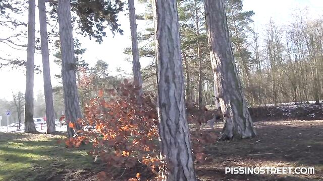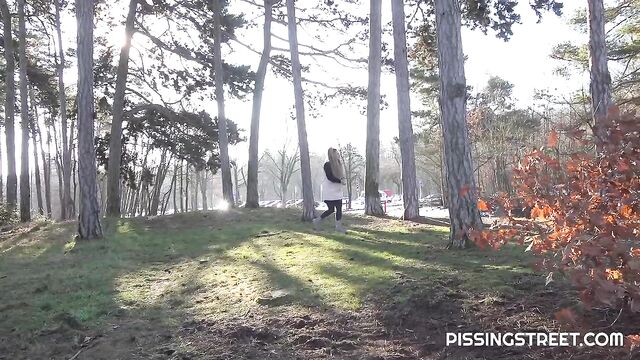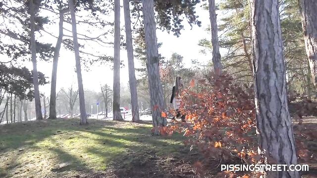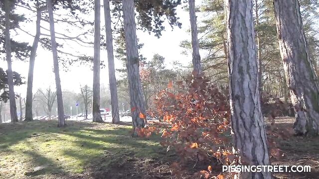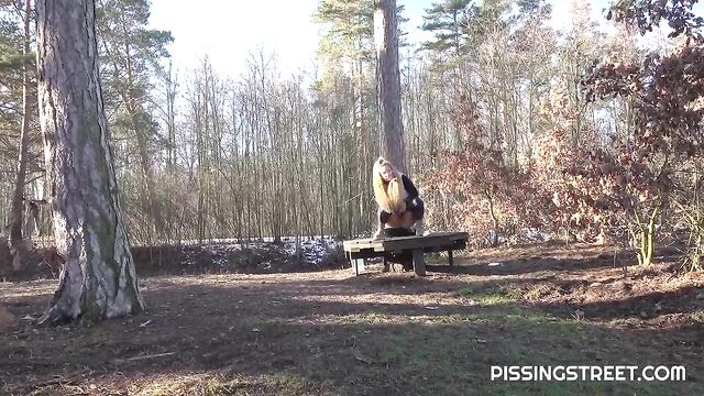 Description:This sexy brunette is walking through the city, and wont make it to the toilet, so she pulls down her trousers and sits on a wooden bench of piss looking very relieved as her golden juices fire all over it!