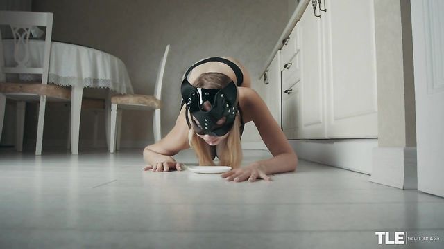 Description:Gorgeous Dominica, a smoking-hot green-eyed blonde from Belarus, is roleplaying as a kinky cat-girl. Showing off her tattooed curves in skimpy black-lace lingerie and stockings, she is wearing a shiny patent leather mask with cat ears – and, on all fours on the floor, she is lapping up a saucer of creamy milk. With sexy feline moves, she licks her lips and hands clean, then wilfully flips over the saucer, deliberately spilling the milk. She’s a bad kitty and she knows it, so she must be punished, and she presents her ass in her sexy black thong for a whipping with a riding crop from her Mistress. This just turns her on even more and soon her manicured fingers are inside of her panties, then unfastening her bra to reveal small, perfect breasts with stiff, light-pink nipples. She cups and massages her tits, then turns her attention back to her crotch. Her panties are peeled down and off to expose her shaved pussy – then, on hands and knees, she begins to masturbate. The camera moves in for a close-up of her oozing-wet snatch and her tight asshole. Full lips pouting, she moans like a mewing, purring cat, grinding against her circling, probing fingertips. As her pleasure increases, she points her toes in her black stockings, balancing gracefully on her knees as she raises her feet off of the floor. Her naked body arches and undulates, then she sits back against the wall, thighs splayed, and tastes her pussy juices from her fingers, relishing them like she enjoyed the cream. Then they tease her butterfly lips once more and her body quivers as her orgasm builds. Sprawling back with one long leg raised high, she edges herself toward the brink, moans getting louder to become sighing gasps. Soon, stretching like the elegant cat-babe she is, she cums hard, and her body tenses and spasms in movements that are suddenly beyond her control. Soon, however, she is sitting up, sensually stroking her body blissfully as the movie ends…