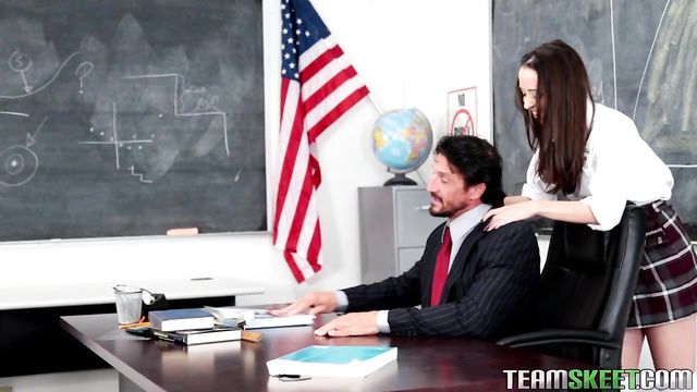 Description:Nikki was going to get some help from her teacher after class but he was on the phone with his wife. She overheard him talking about how they are never intimate anymore so she took advantage of what she heard and made a deal with Mr.Gunn! If he helps Nikki out, shell help him out! Nikki took out the teachers meat, licked it and sucked it like a pro! She was desperate and hungry for her teachers big dick inside of her. Mr. Gunn bent Nikki over the desk and pounded into her tight 18 year old twat! Finally she got on her knees and happily accepted his load to her face!