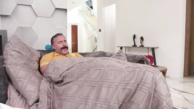 Description:Rachel Cavalli comes home to find her husband, Charles Dera , seated on the couch with a blanket over his lap. He looks a bit odd, and when she touches his head, he feels hot. Good grief, he must be getting sick! She leaves the room to get her poor hubby a cold compress, having no clue that he's hot for a very different reason. Under the blanket is actually his mistress, , who's busy bobbing up and down on his dick. He wasn't expecting his wife to come home, but he can't stop now. Guess it's time for some raunchy under-the-blanket hanky panky... right under his wife's nose!